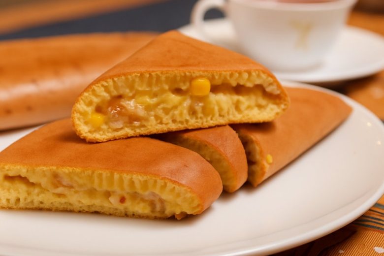 Add butter, cream corn, crushed peanuts and sugar onto the pancake. Fold the pancake into half once the bottom surface is browned.
