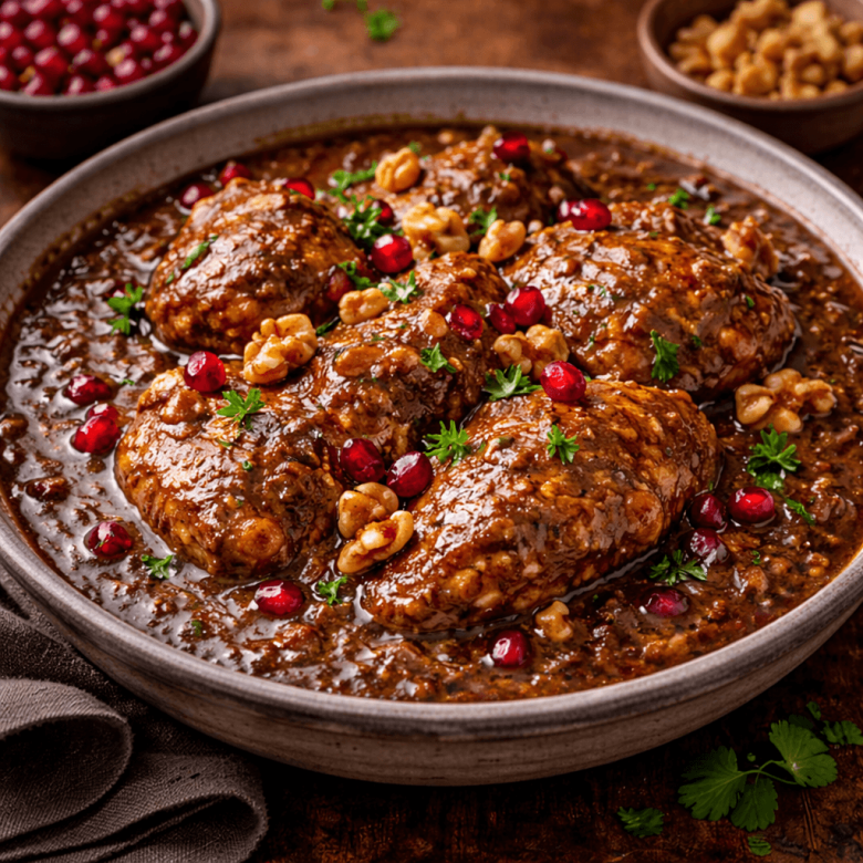 Fesenjoon is a nutty Persian chicken stew that boasts deliciously subtle layers of flavour thanks to pomegranate molasses, tomatoes and spices.