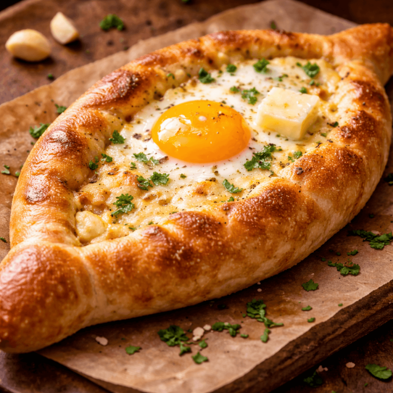 6. Bake in the preheated oven for 15 minutes. Form a well in the center of each khachapuri using a spoon; crack an egg inside each well.